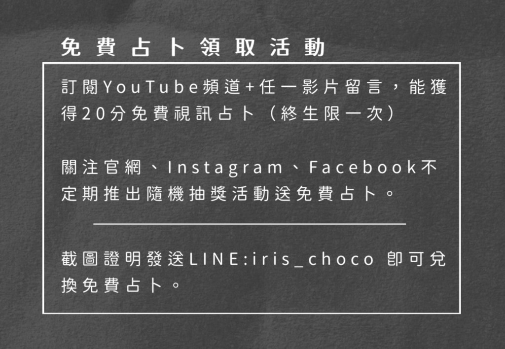 ★★★領取免費占卜或預約占卜,截圖證明(轉帳訂閱留言)發送Line ID :IRIS_CHOCO 領取預約★★★